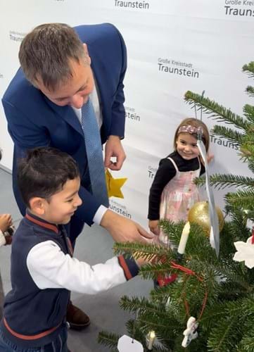 Oberbürgermeister Dr. Christian Hümmer durfte mithelfen und freute sich über den von den Kindern gebastelten Baumschmuck. (Foto © Große Kreisstadt Traunstein)