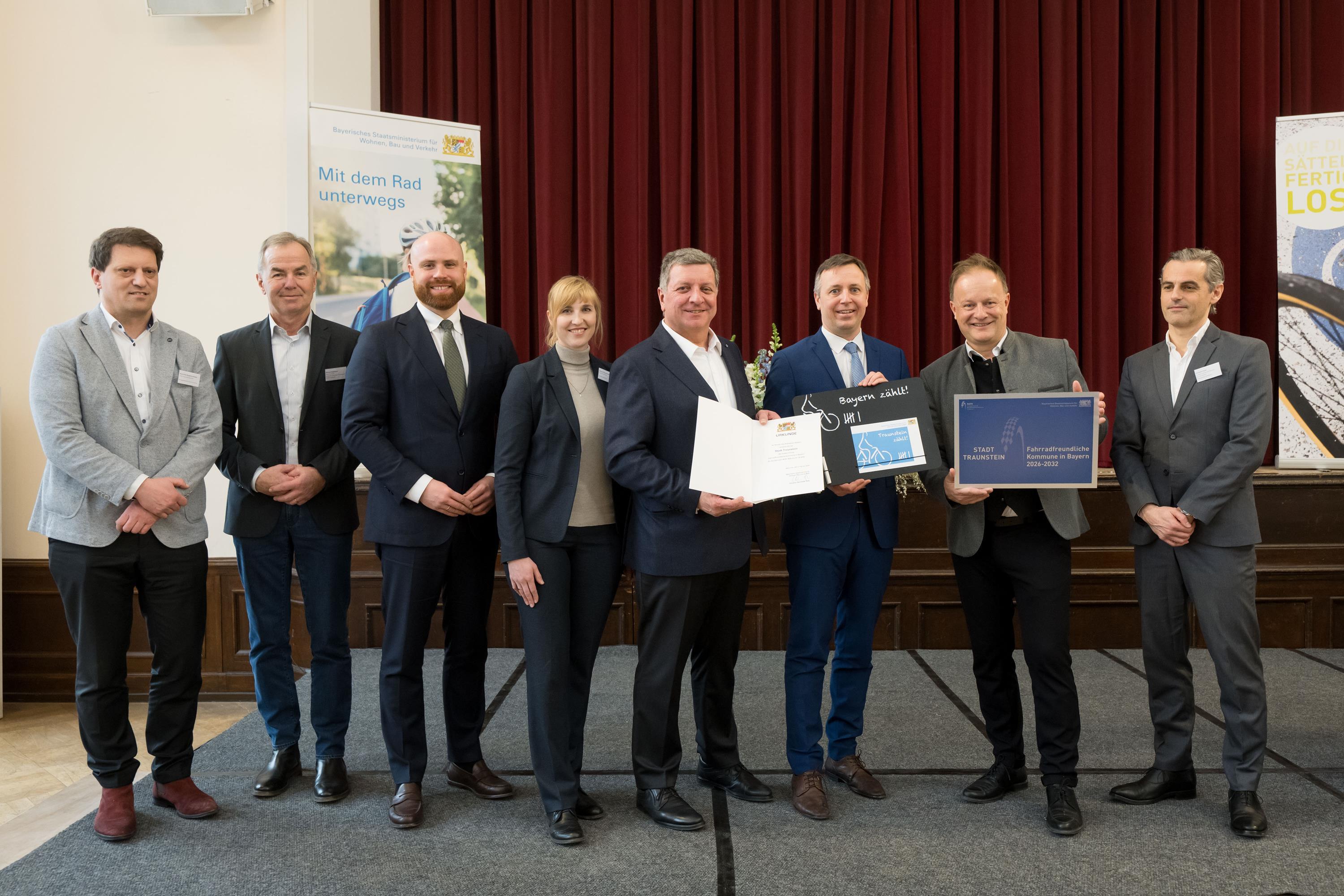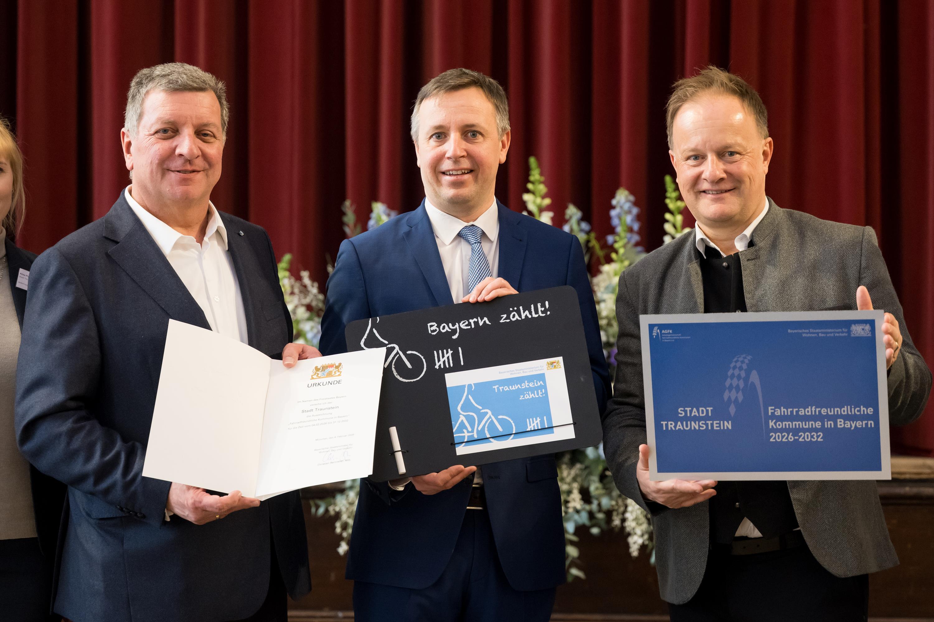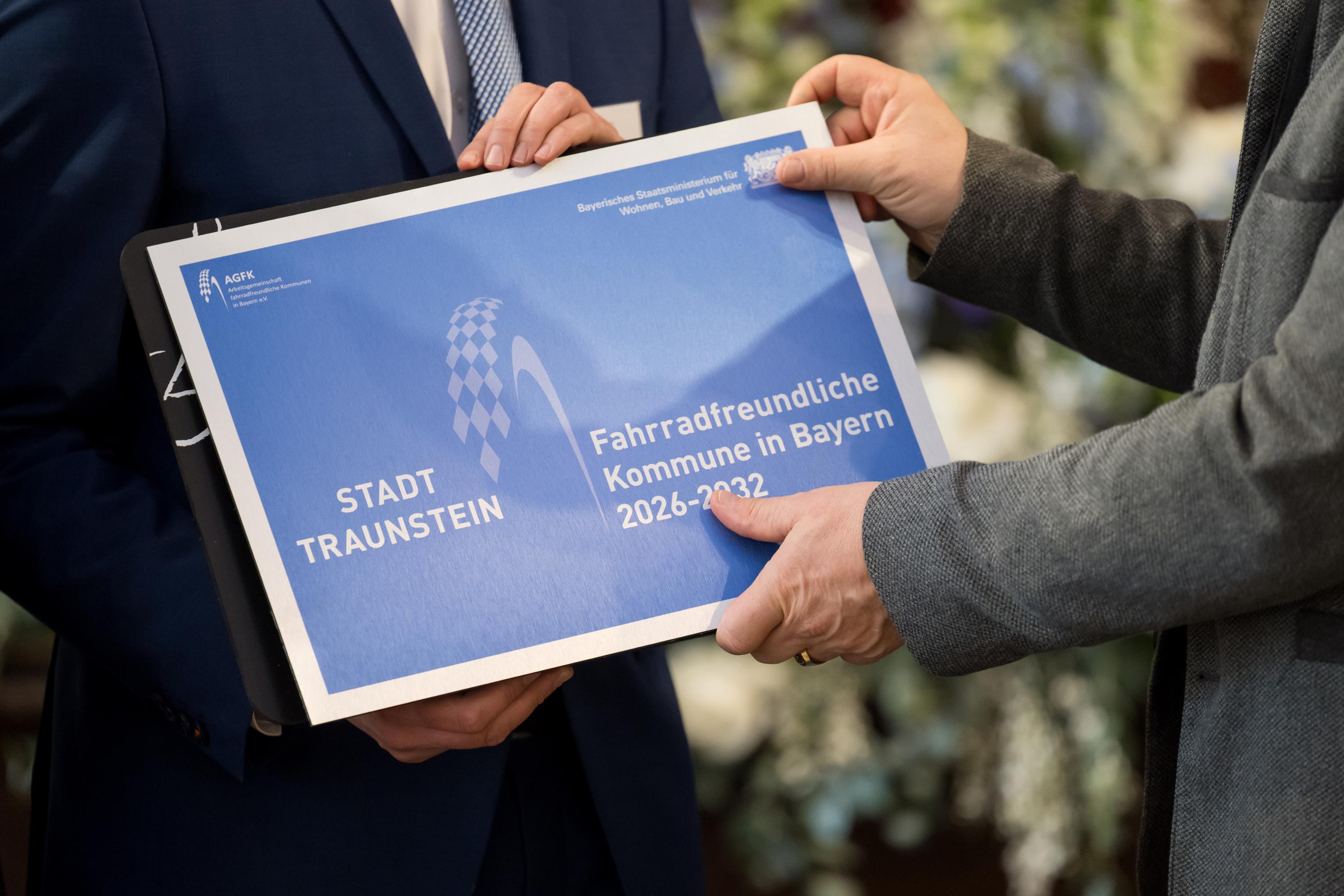 Im Oktober 2025 fand dann die Hauptbereisung statt. Die Große Kreisstadt durchlief ein anspruchsvolles Prüfverfahren. Das Ergebnis: Traunstein wird für die Verleihung des Titels „Fahrradfreundliche Kommune“ vorgeschlagen. Am 4. Februar 2026 wurde der Großen Kreisstadt Traunstein schließlich der Titel „Fahrradfreundliche Kommune“ durch Bayerns Verkehrsminister Christian Bernreiter bei einem Festakt in der Scholastika in München verliehen.